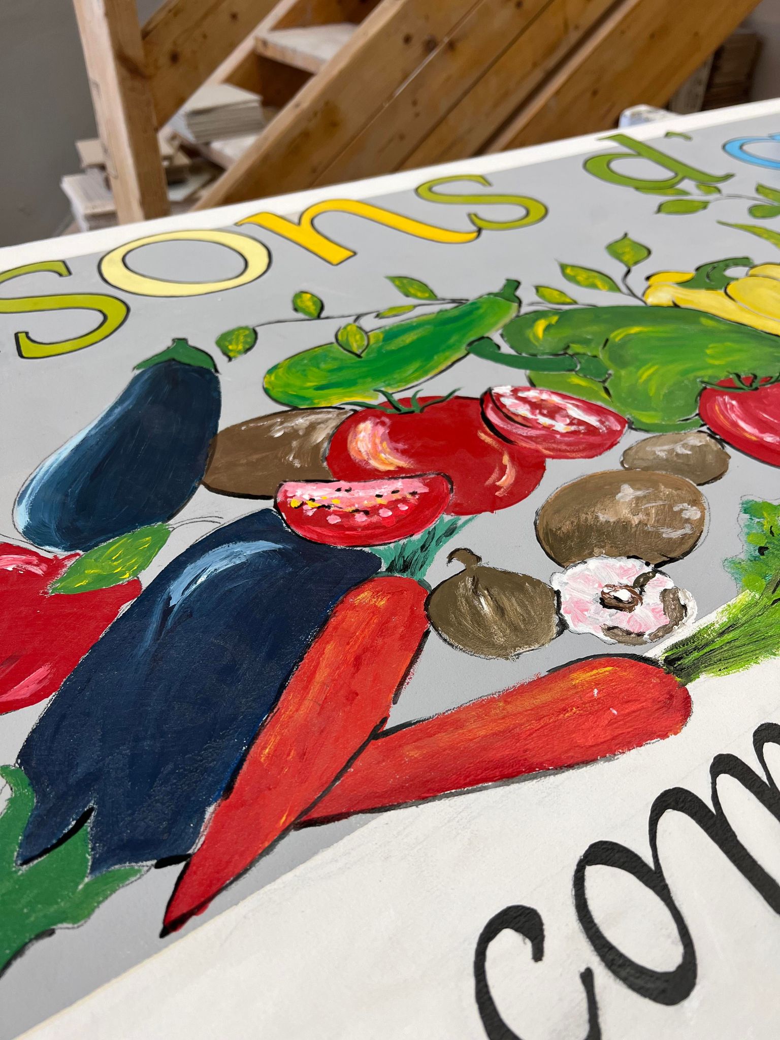 Marie Minatchy, éducatrice technique de l’atelier peinture du VDJ et Frédéric Jalleau, enseignant au pôle ambulatoire, adeptes de la technique peintre en lettres et 4 jeunes se sont lancés dans la réalisation de deux panneaux de signalétique et d’affichage du chantier maraîchage « Les 4 saisons d’Atouts » afin de faciliter la communication de vente des légumes biologiques du chantier d’Insertion Maraichage Bio.